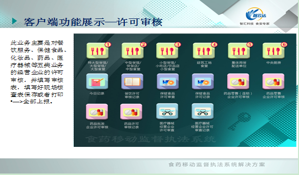 業務組成:分為云平臺中心管理系統和食安寶(移動執法包客戶端)。主要業務監管餐飲服務、保健食品、藥品、醫療器械、化妝品等五類業務。