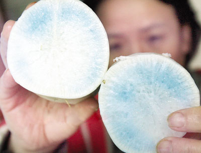 網(wǎng)上流傳更多的說法是:藍心蘿卜是商家為了讓蘿卜能長期存放,特意打的保鮮劑。藍心蘿卜有毒性,對人體有害。對于這種說法,范志紅表示,這幾乎沒有可能性。一方面由于人工染色情況下,人工色素顏色比較穩(wěn)定,一般遇到酸堿都不會變色;另一方面是由于蘿卜本身的價格很便宜,而添加保鮮劑需要大量的人工成本,一天花幾百塊錢的人工成本去加保鮮劑,商家“犯不上”。