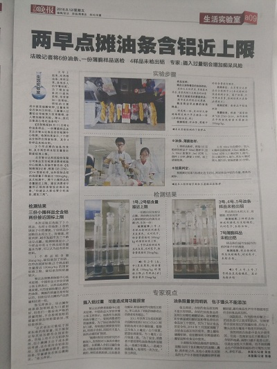 檢測結果:六個樣品均符合國家標準。但是來自路邊小攤的1、2號樣品比其他樣品均高且快要接近國家標準。北京智云達提醒廣大消費者應到正規早餐店購買油條,切勿貪圖便宜到路邊攤購買油條。