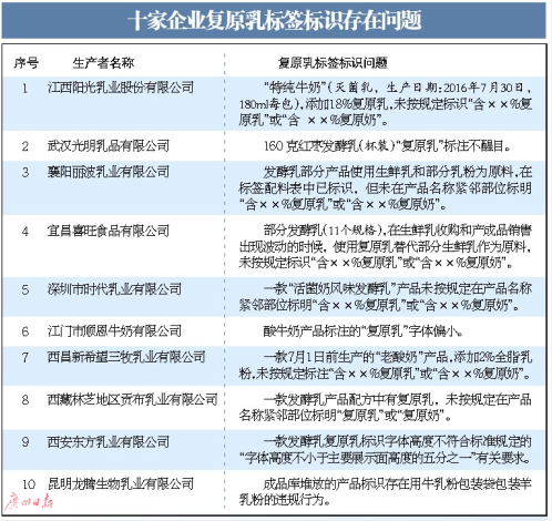這10家復原乳標簽存在問題的企業中,有6家使用了復原乳卻完全不做標注;有三家“復原乳”標注顏色色差不明顯、字體高度不符合規定要求;另外,查處1家企業違規使用牛乳粉包裝袋包裝羊乳粉。