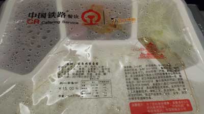 G523從北京西站發車時間是下午16:30,到武漢站的時間是晚上21:50,這個時間段正好是晚餐時間,18點不到,高鐵售貨員開始推著售貨車叫賣晚餐盒飯。記者所在的12車廂有幾位乘客詢問晚餐價格,售貨員推薦的都是40元的梅菜扣肉套餐,擺放在售貨車的外面,最后只有1位乘客購買了一份40元的梅菜扣肉套餐。記者多次向售貨員詢問是否有其他盒飯,便宜一點的套餐,售貨員才從餐車內取出15元的套餐,記者點了一份15元的魚香肉絲套餐,套餐內有魚香肉絲、干蘿卜炒肉和包菜共3個菜,感覺挺實惠。很多乘客在晚餐的飯點都是自備的面包、點心和方便面之類的食品。