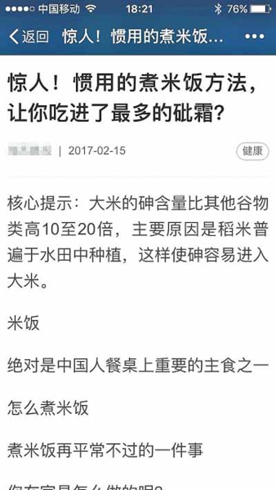 但是,該報道被國內(nèi)一些媒體轉(zhuǎn)載后,一些微信公眾號便借此大做文章,把標(biāo)題改成了“驚人!慣用的煮米飯方法,讓你吃進了最多的砒霜?”或者改成“實驗證明,中國人最常用的煮飯方式,居然砷殘留物最多”。