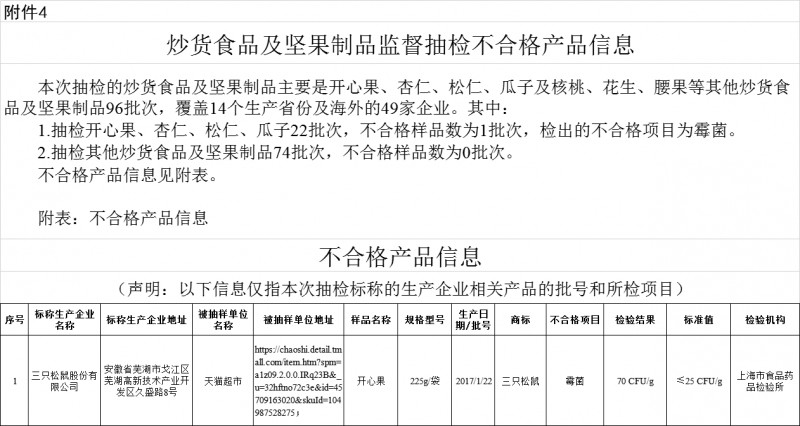 2017年8月15日,國家食品藥品監(jiān)督管理總局發(fā)布3批次食品不合格情況,其中就包括三只松鼠開心果,而不合格的原因則為霉菌超標。