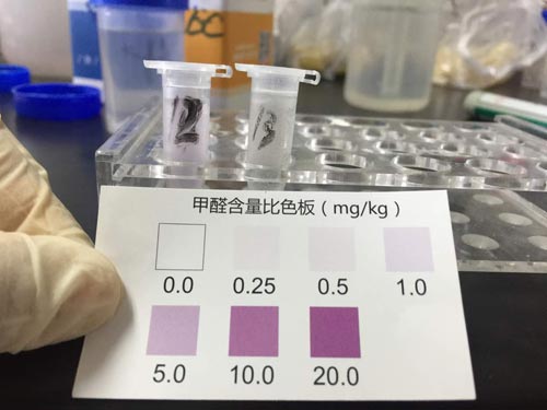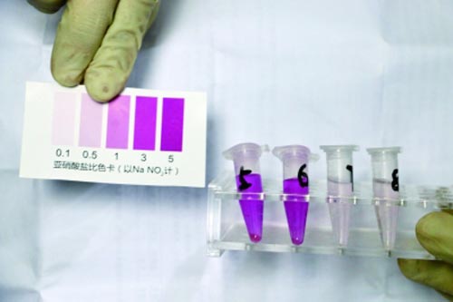 11個樣品檢測液顏色均有變化,均檢出亞硝酸鹽成分。其中5號、6號呈現紫紅色,亞硝酸鹽含量最高,45mg/kg,高于預包裝熟食不得超過30mg/kg的國家限量標準。