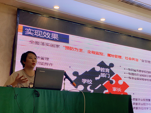 北京智云達資深產品經理錢瑞,為各位參訓學員分享了智云達在校園餐飲食品安全保障中的智能化解決方案,得到了省教育廳領導的認可。智云達作為國內領先的食品安全快檢產品、檢測服務以及信息化構建的供應商及服務商,為校園餐飲食品營養與安全提供保障,打造了集“食品溯源-明廚亮灶-快速檢測-校園餐飲營養與安全監管-第三方檢測服務-食品安全保險”于一體的智能化系統,可實現可視感知、節點預警、過程監督、事后追溯的綜合保障。