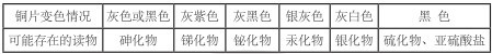 取樣品 5g 于三角燒瓶或蒸發(fā)皿中,加入 25ml 蒸餾水或純凈水,加入 5ml 鹽酸(如為水樣,取樣品 25ml,加鹽酸 5ml 即可),加入約 0.5g 氯化亞錫晶粒,將三角燒瓶放在電熱板上,調(diào)節(jié)溫控旋鈕使樣液微沸約 10 分鐘(驅(qū)除硫化物的干擾),此時加入 2 片銅片,保持微沸約 20 分鐘。注意隨時補加熱水,保持體積不變。若加熱 30 分鐘后銅片表面未變色,可否定砷、汞的存在,如銅片變色,可按下表推測樣品中可能存在的化合物,并可采取相應(yīng)措施加以處理。保留陽性樣品,有條件時分別加以確證。