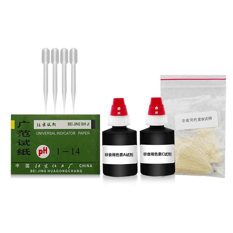 取10mL藍色或綠色可疑液體放入試管中,滴入A試劑調pH到10~11之間,將試管放入90℃以上的水浴中5分鐘后,如果藍色或綠色褪去變為無色,用涼水冷卻后,再滴入C試劑調pH到2~3之間,放回水浴中,5分鐘后又變回原有顏色,可初步判斷樣品中含有孔雀石綠。 此時, 可用涼水冷卻后, 再用A試劑回調pH到7~8之間(不要高于9),加入B試棉少許,將試管放入90℃以上的水浴中1min,攪拌試棉后將其取出,用清水漂洗試棉,試棉上的顏色不褪可進一步判斷樣品中含有孔雀石綠,有條件的可將樣品送實驗室進一步確證。