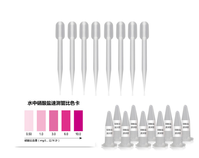 硝酸鹽是含氮有機物氧化分解的最終產物。如水體中僅有硝酸鹽含量增高,氨氮、亞硝酸鹽氮含量均低甚至沒有,說明污染時間已久,現已趨向自凈。此外,水中的硝酸鹽也可直接來自地層。本速測管適用于水中硝酸鹽的快速檢測。