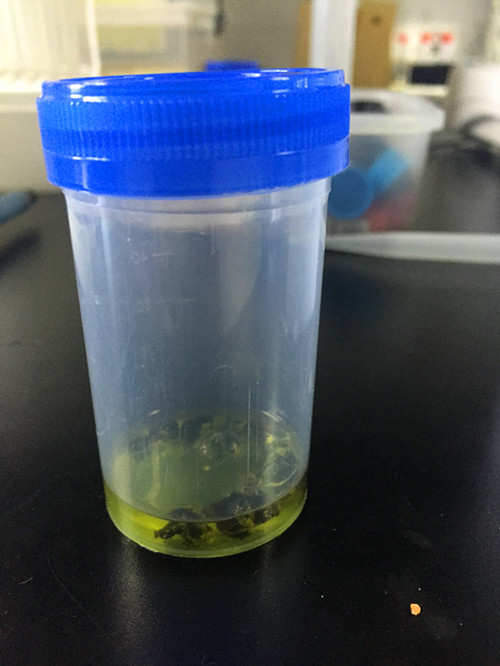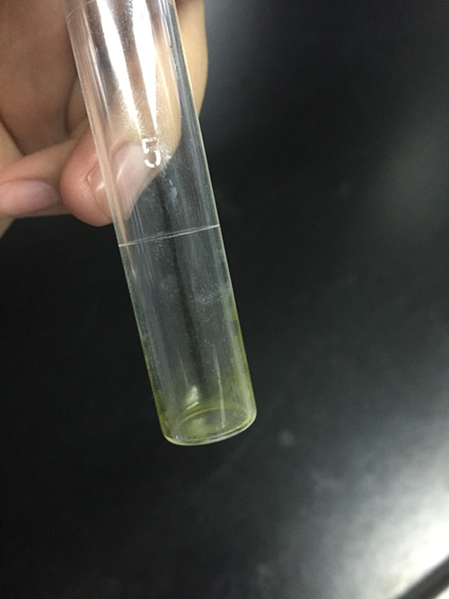 待上層容易清澈后,用移液槍移取0.5ml提取液到比色管中,之后用洗耳球吹干丙酮,得到附著于比色管壁的綠色物質;