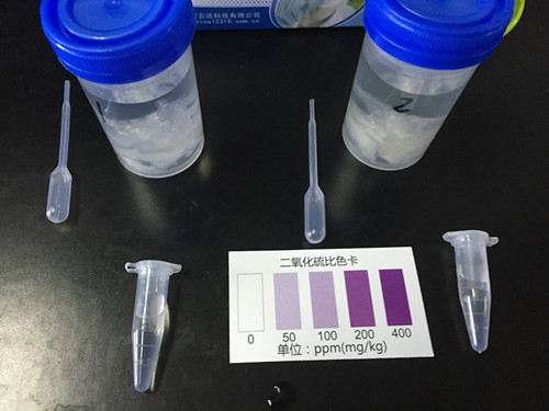 在1.5ml離心管中先滴加2滴檢測液A,1滴檢測液B,上下?lián)u動,混勻;然后加入1ml樣品液,立即蓋塞混勻。放臵5分鐘觀察顏色變化,并與色卡對照,得出樣品中二氧化硫或亞硫酸鹽是否超標(biāo)的信息。