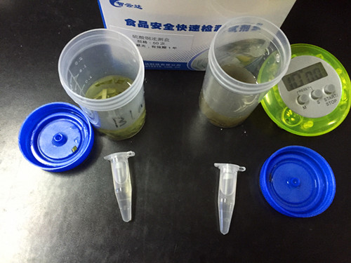吸取 1mL 樣品液于 1.5mL 離心管中,滴加 3 滴銅試劑 A,滴加 3 滴銅試劑 B,滴加 6 滴銅試劑 C,蓋塞混勻,靜置 10min,觀察溶液顏色變化。溶液變藍(lán)色或者綠色,說(shuō)明含有硫酸銅;溶液不變色說(shuō)明樣品未噴灑硫酸銅。