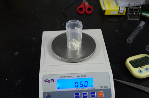 將樣品粉碎,稱(chēng)取0.5克粉碎的樣品。