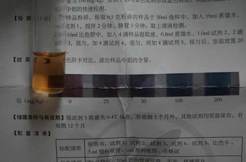 對(duì)比標(biāo)準(zhǔn)色階卡,讀出樣品中鋁的含量。結(jié)果顯示鋁合格,均符合國(guó)家標(biāo)準(zhǔn)。