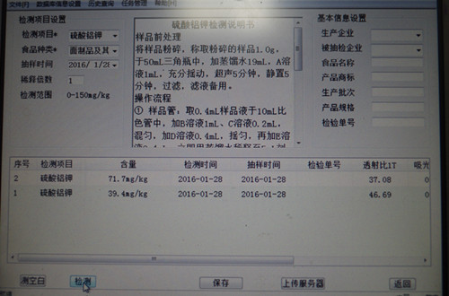將裝有空白液和樣品液的比色皿分別放入儀器中,檢出樣品中均含有鋁,國標中規定,鋁允許在粉絲、粉條中作為添加劑使用,殘留量小于等于200 mg/kg。