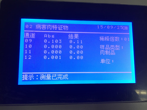 結(jié)果顯示樣品中POD活性值低于正常豬肉,疑似病害肉。快速檢測(cè)只能作為初篩,建議送到第三方檢測(cè)機(jī)構(gòu)進(jìn)行定量檢測(cè)。