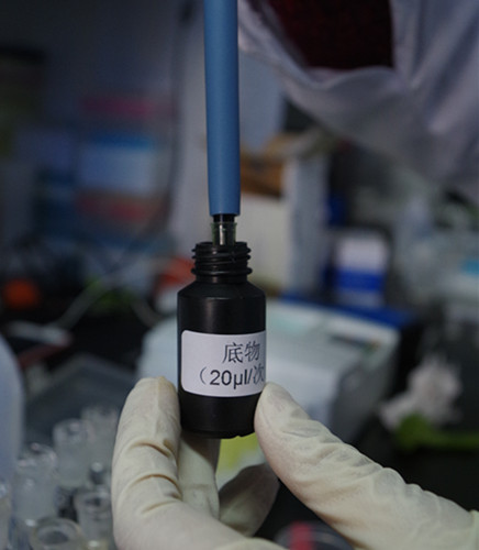 在離心管中,用移液槍依次加入4 mL緩沖液,20 μL顯色劑和50 μL酶,搖勻,靜置10 min。然后用移液槍加入20 μL底物。搖勻后立即轉移到比色皿中,放入儀器(通道1)。