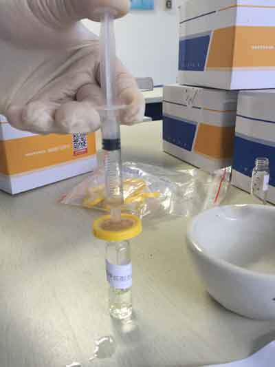 拔下注射器活塞(及針頭),接上過濾器,將A瓶上清液倒入針筒內(nèi),裝入活塞擠壓,收集全部濾液于試劑B瓶中。
