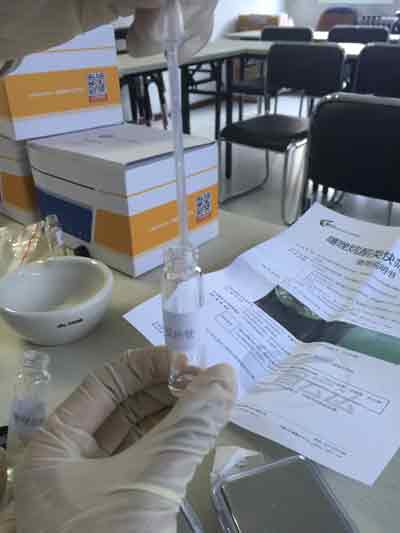 上下顛倒混勻約30秒,靜置。用0.5mL塑料吸管吸取上層樣品處理液,放于反應管中,滴加3-5滴試劑C,靜置觀察結(jié)果。
