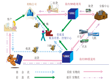 省中心、郵購公司、收寄局、投遞局和客戶,其五者之間的關系如下頁圖所示: